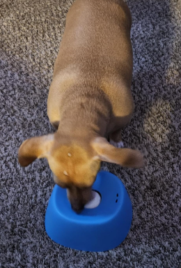• I have a 60ish lb super chewer pup and struggle to find cognitive toys that she won’t immediately turn into rubble. This toy was pretty intuitive and she immediately took to licking it without chewing. I filled it up about 3/4 the way up with the ball in the bowl, using a pretty thin mix of snacks, and she finished it in about one hour. Pleased with how easy it is to pop the bowl in and out. Sturdy feel and weight. I also loved the bright blue color since dogs can see it better! All around love it and very happy!